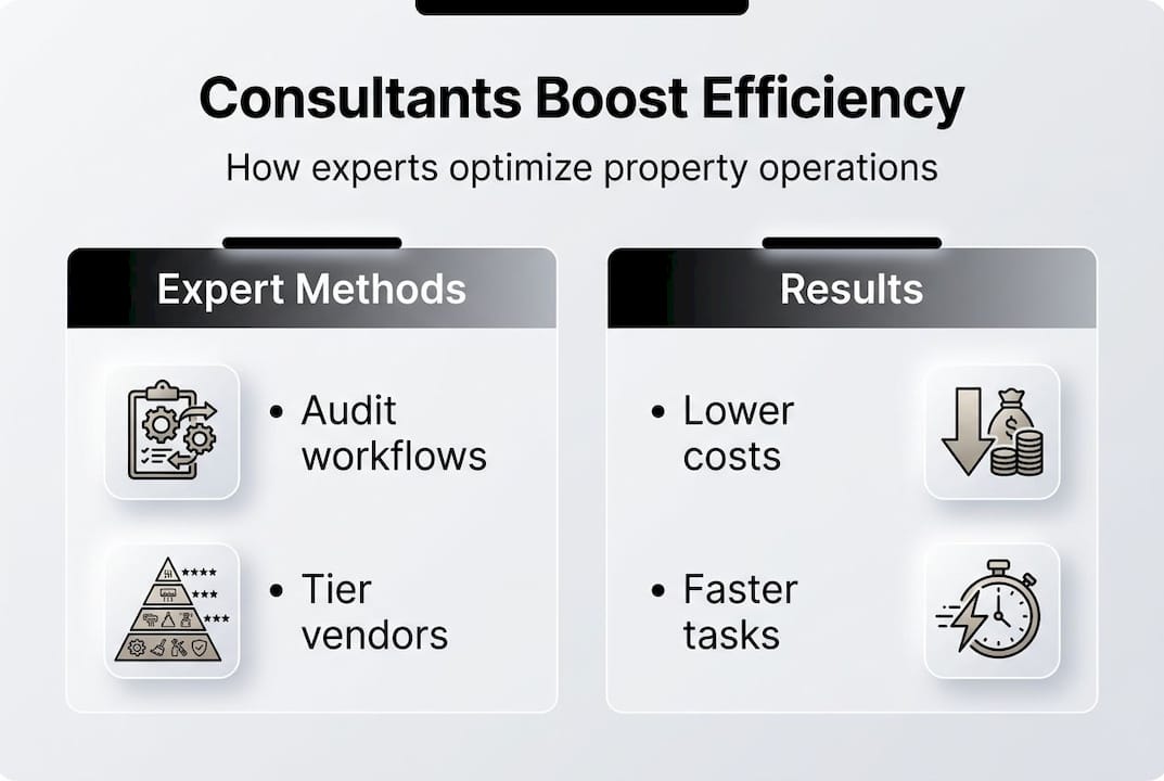 Consultants bring specialized frameworks that address these gaps directly. They assess vendor relationships, identify process redundancies, and establish risk controls that your in-house team can maintain long-term. As noted in vendor vetting best practices, structured consulting shifts property ops from reactive to predictive, preventing costly emergencies.